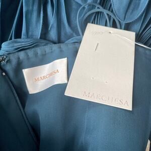 Teal Knife Pleated Marchesa dress. Dress features black crystal and bead embellishment at bodice. Dress is strapless, pleated embellishment at bodice, a softly structured internal bodice, asymmetric ruffles at bodice, a tiered ruffled skirt, a concealed zip fastening at back and is fully lined. Retail 4300. Note one missing gem on back of dress.