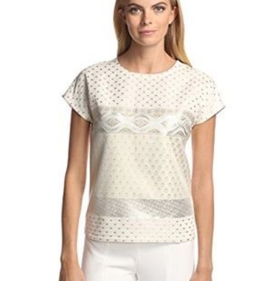 New without tags. Cream base. Gold and silver thread embroidered detail. High neck. Short sleeve. 3 button closure at back of neck. Boxy fit.