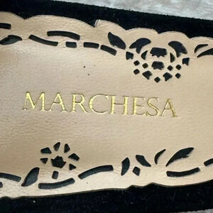 Women's Marchesa "Sierra" Heels EU Size 39.5 which is equal to a US 8.5. Black Suede & Patent Leather with 4.5" heel height. Whipstitch trim design with Black matte rose detailed square ankle buckle. As seen on Eva Longoria at the Eva Longoria Foundation Dinner in 2016. Made in Italy. These are gently used and perfect for date night, black tie or wedding events. Retail is $995.