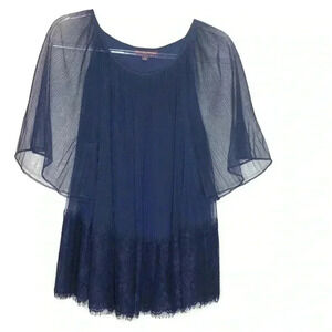 Marchesa Voyage navy pleated blouse, batwing sleeves. Very beautiful top, sleeves are see through, the rest of the top is lined.