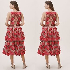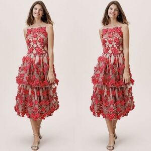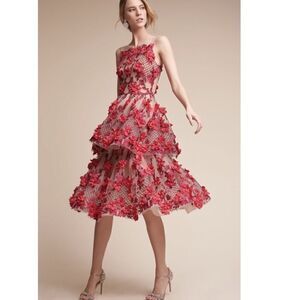 There's a lot to love about this head-turning dress, from its tiered, A-line silhouette to a bounty of 3D blossoms and geometric mesh accents