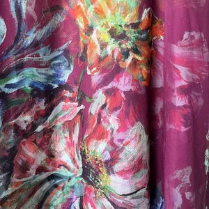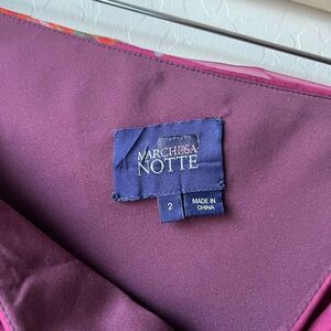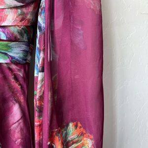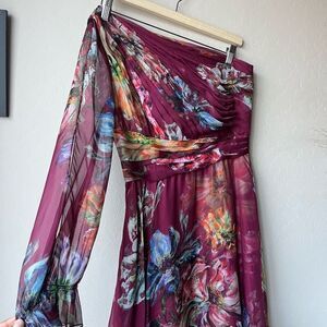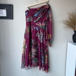 Marchesa Notte Burgundy Floral Print One Shoulder Chiffon Midi Dress Size 2