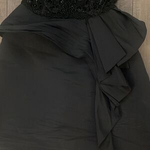 Black faille (95% Polyester, 5% Spandex). Sleeveless. Crew neckline. Full skirt. Hidden side zipper with hook-and-eye closure. Partially lined. 36” from shoulder to hemline. Imported.