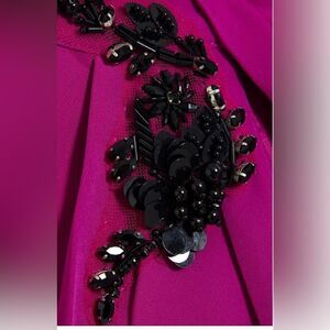 Accentuate the figure-skimming fit with sky-high heels for evening events gown crepe crystals sequins beads pleated concealed hook and zip fastening at back fully lined non-stretchy fabric mid-weight fabric dry clean imported. 97% Polyester 3% Polyurethane. Color: purple