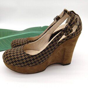 Marchez Vous x Yeardley round toe retro houndstooth over suede wedge heels with buckle closure, size 8.5. They are gently pre-owned and free from any stains or flaws. May show light wear or scuffs from normal use. 4.5" over 1" wedge heel and platform.