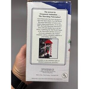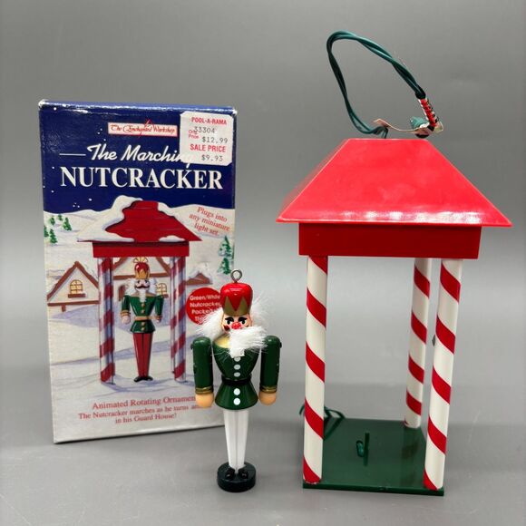 Vintage 1994 The Marching Nutcracker animated rotating ornament by The Enchanted Workshop, manufactured by Capricorn Electronics Ltd., Hong Kong. Features a wooden Bavarian-style nutcracker in a red and white candy-striped guard house that plugs into any miniature Christmas light set. When powered, the nutcracker rotates and moves his arms up and down. Comes complete with original box, insert, instructions, and wiring intact. Box has light storage wear but ornament appears unused and in excellent condition.