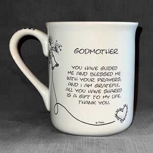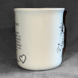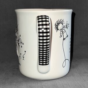 - White, oversized glass mug featuring illustration of wild haired figure surrounded by hearts & flowers