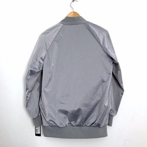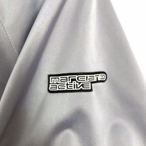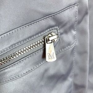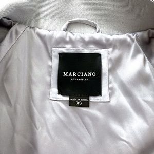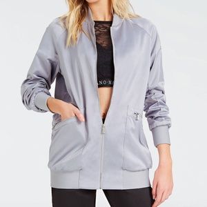 A silver hued long-line bomber jacket, perfect for covering up after your intense yoga/spin/pilates sessions. The satin sheen of the jacket is ornamented with a small classic Marciano logo on the left bicep. Bottom of jacket hits at upper/mid thigh. NWT.