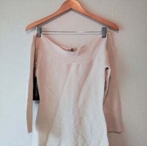 This stunning Marciano dress features an asymmetrical off-the-shoulder neckline and long sleeves, perfect for a wedding guest or cocktail event. The bodycon style hugs your curves in a sophisticated white and cream palette, while the cut-out details add a modern touch.