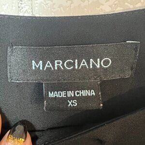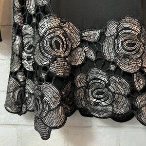 Marciano Black Long Bell Sleeve Sequin Silver Roses Dress XS. Women’s Black Shift Dress Tunic Silver Sequin Rose Detail. Features: care tag has been removed but feels like polyester, lined, long sleeve with slightly flared cuff, stunning silver sequin rose pattern at hemline. Pre-owned condition, normal wear.