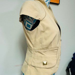 Marciano Blazer Women 10 Tan Deep V Zip Front Gold Studs Cap Sleeves Peplum Back