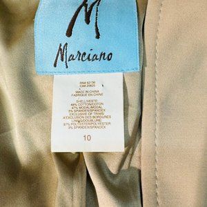 Elevate your wardrobe with the sophisticated charm of this Marciano blazer in a women's size 10. The chic tan hue makes this piece a versatile addition, perfect for both office attire and evening events. Exuding elegance, the blazer features a deep V neckline leading into a smooth zip front closure, offering both style and ease of wear. Cap sleeves add a unique touch to the traditional blazer silhouette, making it an ideal choice for warmer climates or layered looks. Gold stud embellishments meticulously placed around the garment provide a hint of luxury and subtle shimmer. Designed with a flattering peplum back, this blazer accentuates the waistline while offering a graceful, flowing profile. The two front pockets are both stylish and functional, featuring a quilted design that adds texture and interest to this exquisite piece.