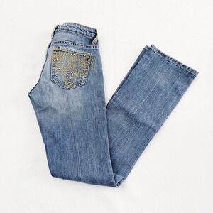 Boot cut denim jeans with jeweled accents, great wash, beading on back pockets