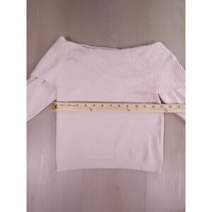 Chic and feminine Marciano off-the-shoulder sweater top in a soft, stretchy viscose blend. Features a ribbed foldover neckline that sits beautifully across the shoulders, long sleeves, and a fitted silhouette that flatters the figure. The blush pink color is elegant and easy to style for day or night.