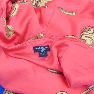 Make a bold entrance in this Marciano red halter maxi dress, a stunning choice for weddings and formal celebrations. With a vibrant red hue and elegant gold-accented detailing, this sleeveless gown flatters with its flowing silhouette and high neckline. Crafted from a luxurious, draping fabric, this dress moves beautifully and captures attention from every angle.