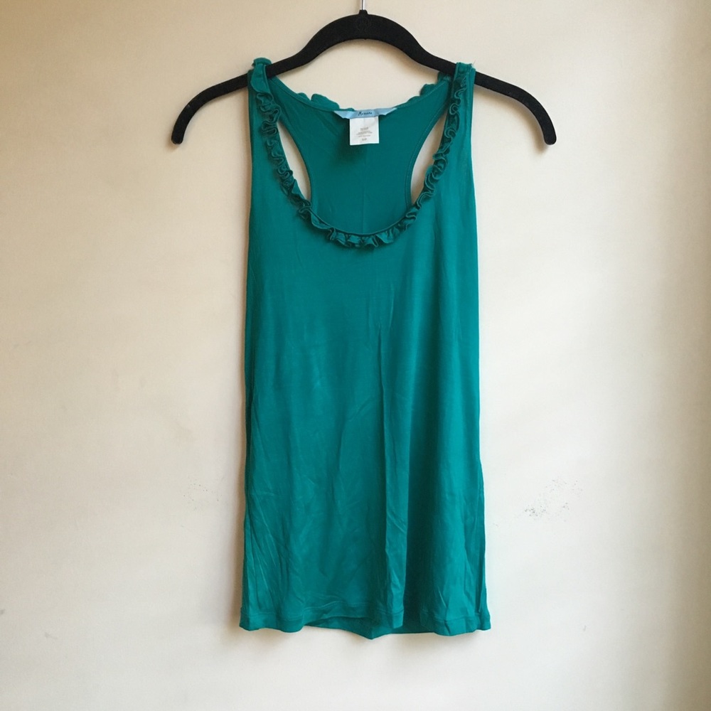 Marciano 100% Silk Teal Ruffled Tank. In very good used condition. Light wear throughout and wrinkling due to moving and storage. Please refer to all photos!