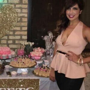 Condition: Good pre-owned condition, worn once. One small spot at the bottom front of the peplum. Also, double sided tape marks on the inner part of the top.