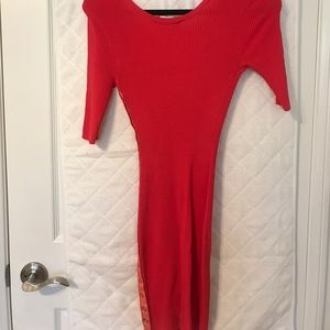 Marciano dress in color coral. Snap buttons in the sleeves and on the left side of the dress. 83% viscose 15% nylon 2% spandex