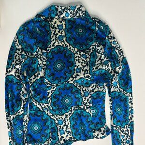 Blue and turquoise printed 70s style paisley top from Marciano. Clasps in front with a corset. Super sexy, 93% silk, 7% spandex.