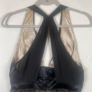 Marciano Black Sleeveless Halter Style Silk Top Size Small. Excellent pre-owned condition. Back zipper closure. Plunging neckline. Gold toned lining with floral design. Measures approximately chest 29", length 26".