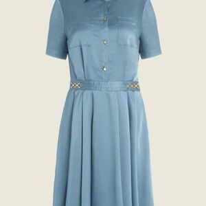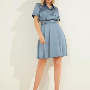 Sophisticated and feminine, this light, floaty & pleated midi dress can take you from day to night with ease. Finished with a button-front closure, delicate pointed collar, chic gold hardware accents at waist and fit-and-flare silhouette with charming pleated skirt. It is fitted and accentuates your curves in the most flattering way! Beautiful Blue/Gray color Never worn, NWOT in perfect Mint condition! Hidden zipper on the side and 100% Polyester, Hand wash.