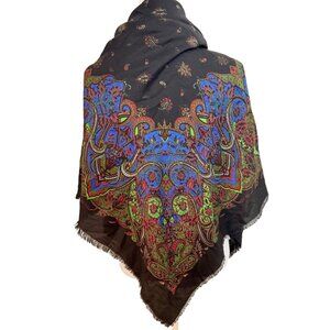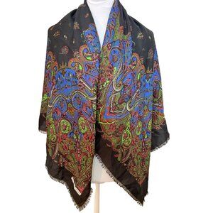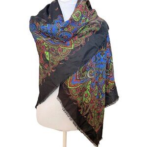 This Marco Corsari scarf features a bold paisley pattern in vibrant multicolors on a black base. Its lightweight fabric and large size offer versatile styling options, from wraps to shawls, making it a valuable accessory for elevating outfits or enhancing comfort in cooler weather. Marco Corsini scarf, likely from the 1970s or 1980s, made in Italy This Scarf is a versatile accessory to be worn around the neck or head.