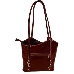 Marco Firenze Italian Leather Convertible Tote Backpack. This is a stunning Made In Italy crafted with Italian leather tote with two long handles that clip and can also convert to a backpack for hands-free carry. The outside leather is a deep purplish burgundy. The all leather interior is a tan color. Zippered pockets on both the front and back. Top secure zipper closure with interior separating zippered pocket, 2 slip in pockets and a side zipper pocket. Plenty of room to carry all your items with this modern and elegant tote/backpack convertible Italian Leather bag.