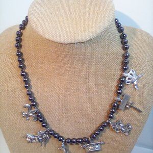 Detailed pewter pendants includes, jester, umbrella, king cake baby,crown, drum, Mardi Gras banner and fleur de lis
