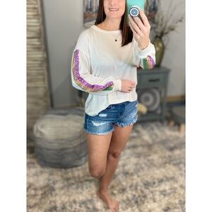 🎭Mardi Gras striped sequined color block sleeves in purple, green and gold top. Of course, it is not just for Mardi Gras. 😁