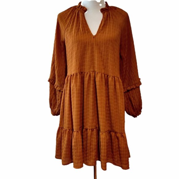 Mare x Anthropologie Womens Anne Gold Brown Balloon Sleeve Tier Ruffle Dress