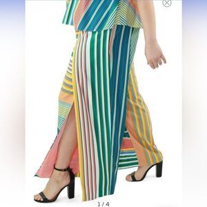 Maree Pour Toi Striped Slit Pants in beautiful pink yellow and green stripes. Love the side slots on the legs. New with tags. Size 22. These pants have some light stretch to them which is so nice. Back zipper. No pockets. Perfect resortwear piece or to take to the pool or beach as a cover-up type piece. These are the definitely the type of pants that you could dress up or down. Measurements in photos. I have the matching top which is strapless and tiered in my Poshmark closet. I also do automatic discounts on bundles of two or more items so check out my Poshmark closet to bundle and save. From retailer: A rainbow stash of stripes clash magnificently in these totally groovy pants, cut in a paneled style that lets you flash some leg with each step.