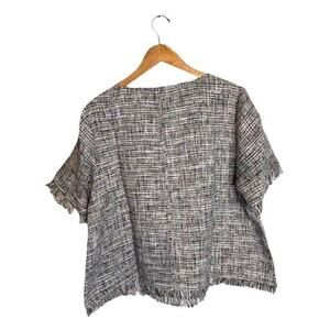 Black and white with gold woven tweed top features fringed hems and short sleeves.