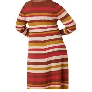 Colorful stripes make the most of fit-and-flare styling on this seasonal-staple sweater-dress, ensuring you'll be wearing it at every opportunity. - Scoop neck - Bracelet-length sleeves - Slips on over head - Stripe print - Knit construction - Imported