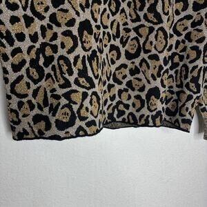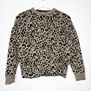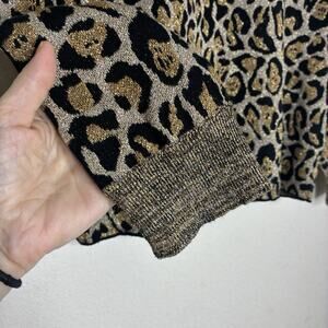 The Marella Metallic Threaded Cheetah Sweater is a stylish and versatile piece perfect for various occasions such as travel, parties, casual outings, or business meetings. The sweater features a tight-knit construction with metallic gold threading, creating a unique animal print pattern that adds a touch of glamour. With long sleeves, a crew neck, and a pullover style, this sweater is comfortable and easy to wear during the winter and fall seasons. Has stretch. A must have for any wardrobe! PLEASE NOTE: Size and fabric tag have been removed but seems like a S/M. Please refer to measurements which are approximate and taken flat.