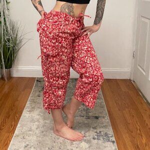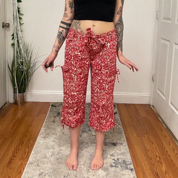Marella Mid Rise Floral Crop Cargo Pants Tie-Waist Straight Leg Size 10 Red
