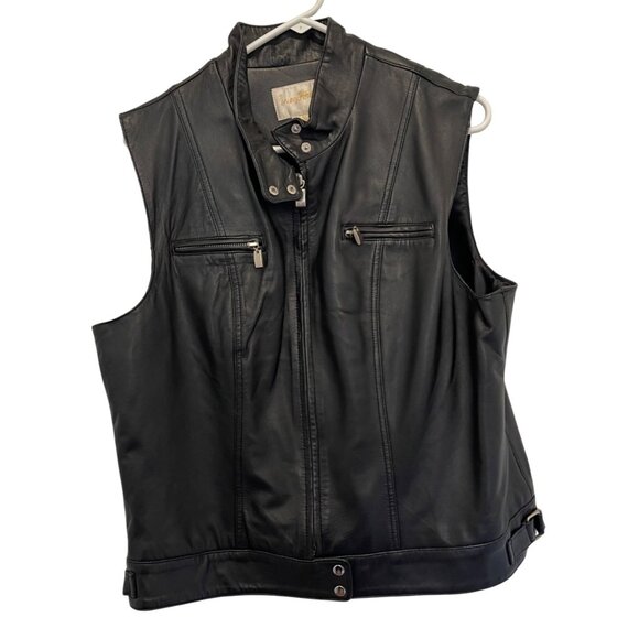 black leather vest, zip-up vest, leather clothing, professional vest, sleeveless jacket, leather apparel, chest pocket vest, fitted leather vest, casual leather vest, biker-style vest, adjustable waist vest, Margaret Godfrey vest, black sleeveless vest