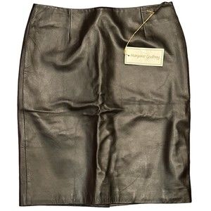 This Margaret Godfrey black leather skirt is an absolute wardrobe staple for any fashion-savvy woman. The skirt is made of high-quality leather material and features a solid pattern with a zip closure. Its A-line style gives it a comfortable yet stylish fit, and the knee-length cut makes it perfect for any casual occasion.
