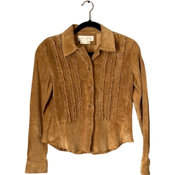 Margaret Godfrey Tan Suede Ruffle Button Front Shirt Size Medium Petite. Super cute western style suede top with a ruffle detail on the front, long sleeves and a full button front closure. Approximate Measurements Laying Flat Armpit to Armpit - 19" Length - 21" Sleeves - 24"