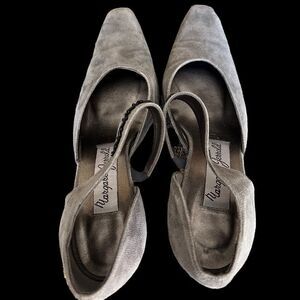 Margaret Jerrold Grey Suede Heels with square heel and metallic sheen