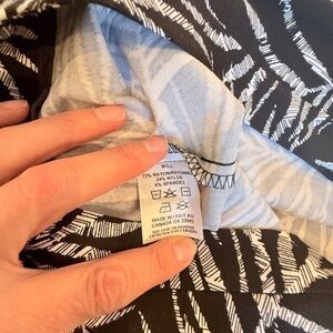 The Margaret M black skirt with palm print is a stylish and comfortable addition to any woman's wardrobe. Made from a blend of nylon, spandex, and rayon, this A-line skirt features a knee-length hem and a flattering stretch fit. The black skirt with a white palm leaf print adds a touch of beachy, tropical style, making it perfect for casual days out or evening outings. Ideal for women in size M, this skirt is both fashionable and practical for everyday wear. Skirt is in excellent, pre-loved condition!