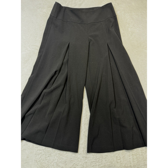 This sophisticated pair of Women's Margaret M trousers features a high-rise waist and a dramatically wide, pleated leg that mimics the movement of a skirt or culotte. The fabric is a smooth, wrinkle-resistant stretch knit (often a polyester/elastane blend), making them ideal for travel, work, or evening wear. The color is a true, deep Coal Black. The structured waist and flowing leg create a modern, powerful silhouette. This item is a Size 12. It is in Excellent Pre-owned condition.