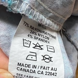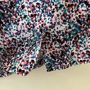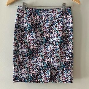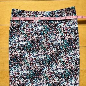 Gently used Margaret M Petites Stretch Straight Pencil Mini Skirt, size Petite XS. Abstract colorful print, stretchy fabric, pull on style with small slit in the back. No zipper or other closure, rayon / nylon / spandex blend fabric has good stretch. Some signs of light wear including some fading from wash but no known flaws, please see pics for details and flat lay measurements. Smoke and pet free home, fast shipping. Thanks!