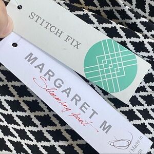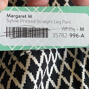 Margaret M Sylvie Slimming Pant Straight Leg NWT Medium. Brand new with tags. Black and white geometric pattern pull on pants. Rayon, nylon, spandex blend. Approximate measurements laying flat 15” waist 10” rise 31” inseam.