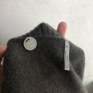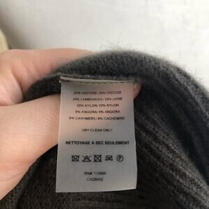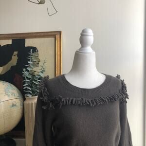 In good preowned condition. Very soft and cozy with a cute fringe detail. Color is a very subdued army green. Nylon, Viscose, Lambswool, Angora, and Cashmere blend. Dress form is a size small so would be slightly more fitted than pictured when worn on its intended size - a medium.