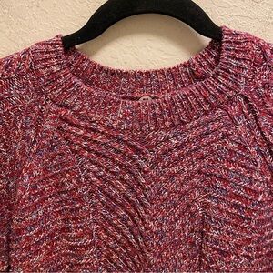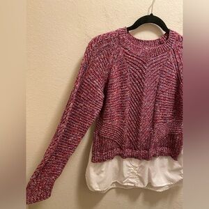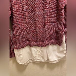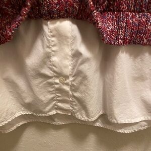 Red, White, and blue marled knit sweater with a built-in white dress shirt hem