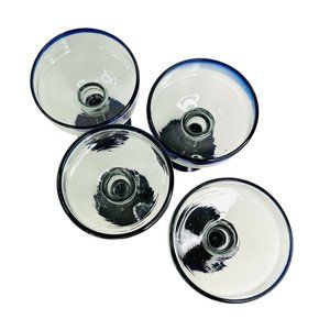 Mexican Hand Blown Margarita Glass Set Thick Heavy Glass Cobalt Blue Rim & Foot 16oz 4 Glass Set. Each glass is hand blown so there are small variations. Some rims have more or less blue coloring. Some of the feet are slightly different shapes and there are a few air bubbles here and there in the glass making them each unique. They are in excellent condition with no cracks or chips.
