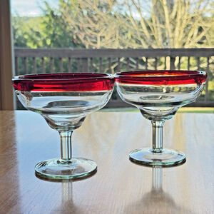 Margarita Glasses Red Rim Mexican Hand Blown Thick Glass Set Of 2 Barware 10 oz