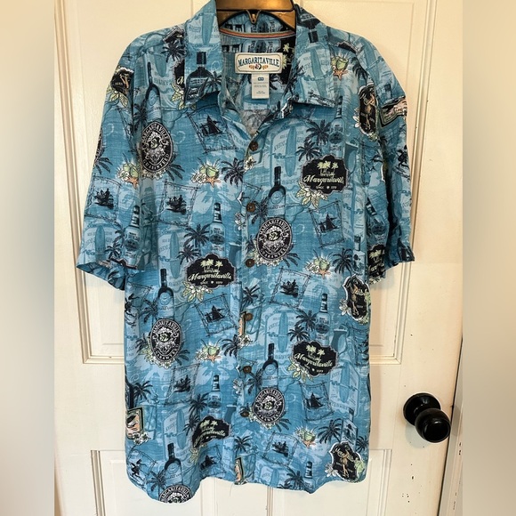 EUC Margaritaville Hawaiian Button Shirt Mens Size Medium 100% Rayon Blue Vacation