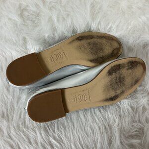 This is a pair of metallic silver, bow toe, slip on ballet flats from Margaux. Handmade in Spain. Some wear on foot beds and soles. A couple of scuffs. 37 M.