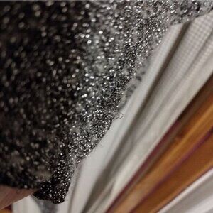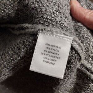 black and gray sweater with metallic threads throughout. There is a pulled area on inner left sleeve cuff, see pictures. very soft despite the metallic threads